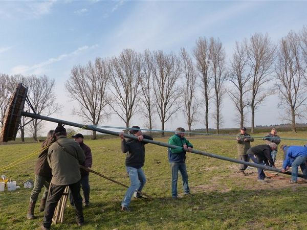 Die Jugendgruppe und Mitglieder des VLE haben nahe der Weschnitz einen Storchenmast errichtet.
