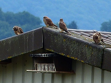 Ein Turmfalken-Paar hatte den von den Einhäuser Vogelschützern hoch oben am Dach eines Flugzeughangars angebrachten Nistkasten angenommen. Die eleganten Flieger hatten fünf Junge aufgezogen - und der Nachwuchs hatte vor einigen Tagen bereits das Fliegen erlernt. Der Nachwuchs kam aber regelmäßig zum Falken-Wohnheim zurück, um sich von den Eltern mit Mäusen füttern zu lassen. Geduldig warteten die Jungvögel auf die von den Eltern erbeuteten Leckerbissen. Mit etwas Glück kann man die eleganten Greifvögel auch in Städten und Dörfern beobachten, wenn sie an Türmen oder anderen hohen Bauwerken Nischen zum Nisten finden konnten. Gerne brütet der Turmfalke aber auch an Waldrändern, in Feldgehölzen und auf Einzelbäumen, etwa wenn ihm alte Nester von Krähen oder größeren Vögeln zur Verfügung stehen. Auch artgerechte Nisthilfen nimmt er gerne an.