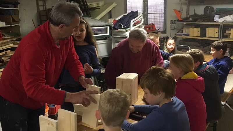 Im Keller des Bürgerhauses haben rund 15 Jungen und Mädchen, einen speziellen Nistkasten für zu Hause hergestellt.