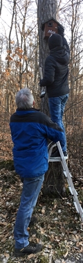 Mit einer Leiter und den nötigen Reinigungs- utensilien wurden die Behälter aus Holz gesäubert. Nicht selten finden Vogelschützer auch ganz andere Tiere als erwartet, wenn sie die Kästen öffnen. Ihre Putzaktion nutzten die jungen Umweltschützer auch dazu, im Wald nach Unrat zu sehen und ihn direkt einzusammeln. Die Vogelschützer ärgem sich immer wieder darüber, wenn unbelehrbare Zeitgenossen ihren Müll einfach in die Natur werfen. Ein weiteres Problem ist, dass die hölzernen Bruthilfen an den Bäumen mutwillig zerstört werden. Ziemlich oft werden die Einhäuser mit demolierten Behausungen konfrontiert. Nach der aufwändigen Reinigungsaktion warten sie nun gespannt darauf, ob und wie stark die Behausungen von den Vögeln angenommen werden.