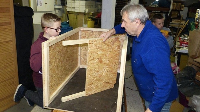 Der Nistkasten für die Nachtvögel wird daher im Inneren des Gebäudes angebracht. Die Mädchen und Jungen des Vereins basteln die Utensilien für ihre Naturschutzaktivitäten zumeist selbst. Jugendleiter Werner Glanzner freute sich ganz besonders darüber, dass zum Bau der Nistkästen so viele junge Hobbyhandwerker in den Keller des Bürgerhauses gekommen waren, um mit Hammer Säge und Bohrer umzugehen. Natürlich legten er und sein Stellvertreter Sebastian Schumacher größten Wert auf Sicherheit während derArbeiten. Der Vereinsnachwuchs wurde an jedem Arbeitsgerät eigens eingewiesen. Die Einzelteile der Kisten wurden nach vorgegebenen Maßen angefertigt und dann von den Kindern zusammengebaut. So ist ein Nistkasten für einen Turmfalken 50 Zentimeter hoch und 40 Zentimeter breit. Die Bruthilfe für die Eulen ist im Inneren mit Zwischenwänden versehen, so dass sich die Eule zum Brüten ungestört zurückziehen kann.