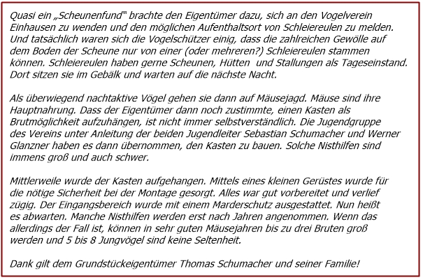 Am Samstag den 21. Januar um 10.00Uhr war Treffpunkt an der Kläranlage Einhausen Süd um in einer benachbarten Scheune unseren selbstgebauten Schleiereulenkasten aufzuhängen. Im Vorfeld haben unser Jugendleiter Werner Glanzner und der für den Naturschutz zuständige Günter Weickert, einige von den Jugendlichen hergestellte Steinkauzröhren in alten Obstbäumen angebracht.