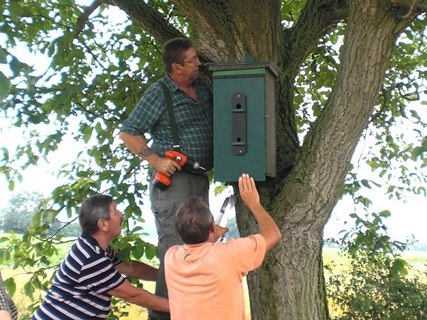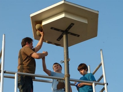Das Schwalbenhaus hatte man bereits bei der letzten Vogelschau als Bausatz vorgefertigt. Es wurde im Vorraum des Bürgerhauses ausgestellt. Da jetzt nur noch das Einlassrohr mit Betonfundament zum Aufstellen benötigt wurde, wurde dies jetzt in Angriff genommen. Nachdem das Betonfundament gut ausgehärtet war, wurde am Vortag mit einigen Erwachsenen des Vereines, der stabile Mast eingelassen und hochgezogen. Nun war der Zeitpunkt für alle Jugendlichen gekommen, dass Schwalbenhaus an der Wattenheimer Brücke aufzustellen.