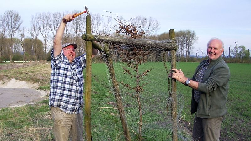 Zum Schluß stellen wir den Schutz zum Verbiss der jungen Bäumchen auf, die zur Markierung der Grundstücksgrenze dienen.