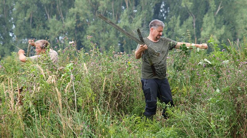 Wenn sich die Natur auch weitestgehend selbst entwickeln soll, so muss doch der ein oder andere gezielte Eingriff vorgenommen werden. So geschehen am Samstag, den 5. August 2017. Kurzfristig hat der Vorsitzende Hermann Heinbach eingeladen, dass ein Pflegegang am Knoblauchkrötenbiotop im Bruch stattfinden möge. Immerhin 11 Mitglieder sind dem Aufruf gefolgt und haben gemeinsam und sehr engagiert die auf der Fläche nicht gewollte Goldrute bekämpft. Mit dem neuen Balkenmäher und mehreren Motorsensen ging man gegen die invasiven Pflanzen vor. Und auch händisch wurden große Wurzelstöcke ausgegraben.