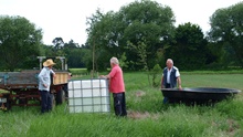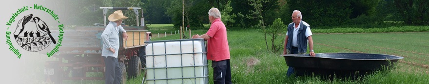 Dieser Arbeitseinsatz war eigentlich für Freitagnachmittag (19.5) geplant, aber es hatte den ganzen Tag geregnet daher wurde der Einsatz kurzerhand auf Montagnachmittag (22.5) verschoben. Das Wetter spielte mit und so konnten wir den Teich bei einem Mitglied unseres Vereines, er hatte ihn schon vor längerer Zeit ausgebaut und auf einer Wiese hinter seinem Grundstück abgelegt, abholen. Wir hoben ihn gemeinsam auf den Anhänger von unserem Mitglied Peter Zehfuß der ihn dann mit seinem Traktor an seinen Bestimmungsort, auf der Schumacher Wiese transportierte. An einer tieferen Stelle der Wiese luden wir den Teich ab und kennzeichneten die Stelle an der er Eingegraben werden sollte.
