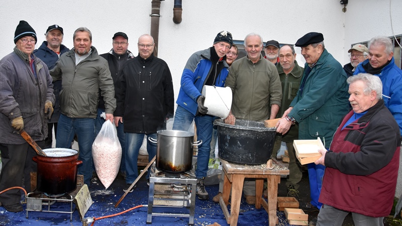 Ehrenmitglied Konrad Gärtner und Vorsitzender Hermann Heinbach informierten darüber, dass es sehr Wichtig ist, den Vögeln nährstoffreiches Futter anzubieten, da kaltes Wetter den Tieren an die Substanz gehe. So verwendet man zur Herstellung Rindertalg. Das Fett wird geschmolzen und mit Futter, in dem unter anderem Nüsse, Haferflocken oder Mandeln enthalten sind, vermischt. Die Masse wird dann entweder zu Kugeln in einem Netz geformt oder in Holzrahmen gegeben. Nach dem Erkalten können die Verpflegungsstationen in Wald und Flur aufgehängt werden. Der Verein betreibt mit seinen Mitgliedern 20 Futterstellen in der Gemarkung, die immer Wieder kontrolliert und - wenn nötig - auch bei widrigem Wetter aufgefüllt werden müssen. Sehr froh ist man bei den lokalen Vogelschützern darüber, dass auch viele Einhäuser Bürger in ihren Gärten für die Vögel sorgen.
