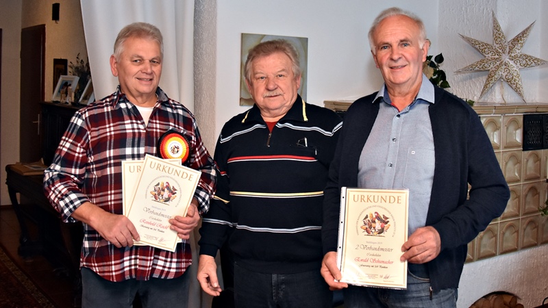 Die Liebe zu den Vögeln wurde Reinhold Reichl schon in die Wiege gelegt. Die Vogelzucht hat über Generationen hinweg eine lange Tradition in der Familie. So begann Reinhold Reichl schon als Jugendlicher in seiner Voliere Vögel zu züchten und später für die Lorscher Vogelschützer auszustellen. Der Erfolg ließ nicht lange auf sich warten. In seinen Volieren leben derzeit zehn verschiedene Vogelarten. Ewald Schumacher entdeckte auch schon als Kind seine Liebe zu dem schönen Hobby - und als ihm sein Vater das erste Gehege für die Tiere zuhause gebaut hatte, ging es mit der Zucht los.Mit 17 Jahren präsentierte er erstmals seine Tiere auf einer Ausstellung. Aktuell beheimatet Ewald Schumacher sechs verschiedene Arten von Waldvögeln. Der erste Vorsitzende der Einhäuser Vogelschützer, Herrmann Heinbach, lobte seine beiden Vorstandskollegen für die tollen Erfolge bei der Landesschau und gratulierte ihnen dazu auch persönlich. Heinbach machte deutlich, dass man im Vogelschutzverein sehr stolz ist, zwei solch engagierte Mitglieder und Züchter in den eigenen Reihen zu haben. Ewald Schumacher und Reinhold Reichl seien außerdem immer da, wenn sie gebraucht werden, machte Hermann Heinbach in seiner Laudatio als Vereinsvorsitzender deutlich.Michael Volk.