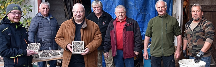 Zur Herstellung unseres Winterfutters waren wir viele Jahre bei Günter Hofmeyer in besten Händen, leider ist unser Günter im Oktober, nach schwerer Krankheit verstorben. Es war eine sehr schöne Zeit in der Almenstraße, ich für meinen teil Denke dass es eine Möglichkeit wäre, an einem anderen Ort wieder ein neues Kapitel aufzuschlagen. Es gibt dazu mehrere Vorschläge, unter anderem können wir in dieser Periode 21/22 bei unserem Vorstandskollegen Klaus Schumacher unsere Fettfutterrahmen füllen. Zwischenzeitlich haben wir uns für Klaus Schumacher entschieden und in der ersten Runde für dieses Jahr 150 neue Futterrahmen hergestellt und befüllt. Auch die Rahmen für die Betreuer der Futterstellen wurden für dieses Jahr zum ersten mal befüllt und das wird, je nach Witterung noch zweimal der Fall sein.