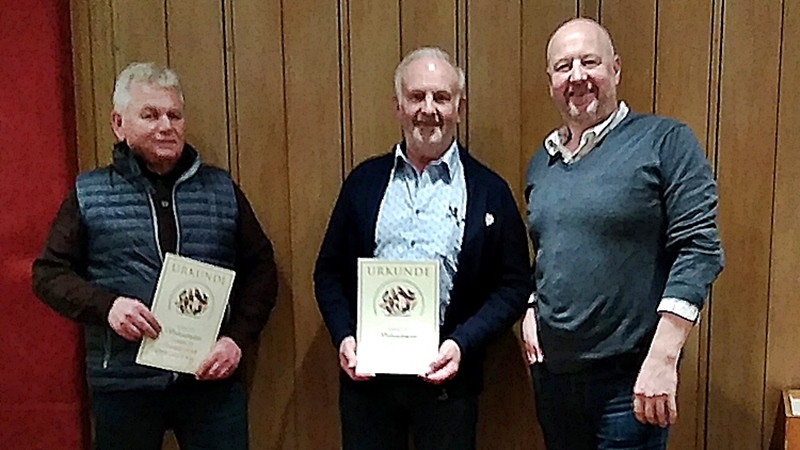 Der heiße Sommer im vergangenen Jahr machte der Sparte Vogelzucht und Vogelhaltung schwer zu schaffen. Reinhold Reichl informierte die Anwesenden darüber, dass in den Außenvolieren Temperaturen bis zu mehr als 50 Grad herrschten, was die Nachzucht sehr beeinträchtigte. Trotz der widrigen Umstände schaffte man es, junge Vögel zu ziehen, die man bei Ausstellungen einem breiten Publikum präsentieren konnte. So waren Ewald Schumacher und Reinhold Reichl bei der Landesverbandsschau in Mehlingen mit von der Partie. Jeder von ihnen konnte mit seinen Vögeln gleich zwei Landesmeisterschaften mit nach Hause bringen. Für diese Erfolge wurden sie jetzt vom Vorsitzenden Alexander Hedderich und Bürgermeister Helmut Glanzner geehrt.