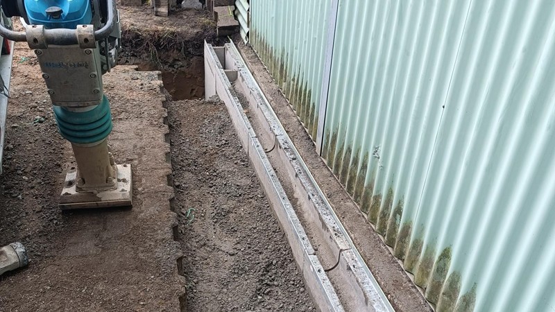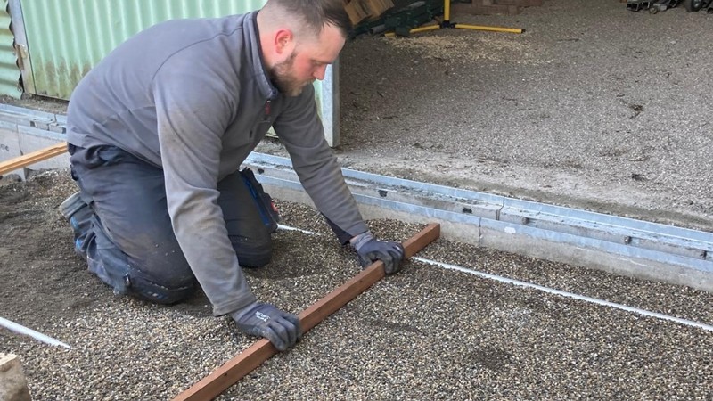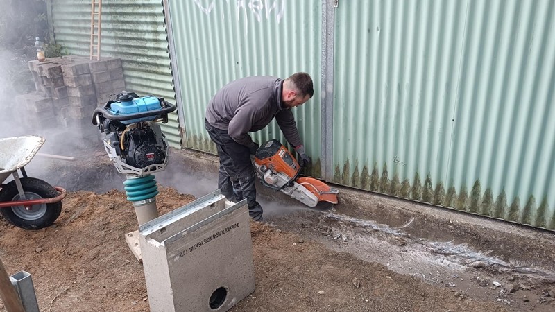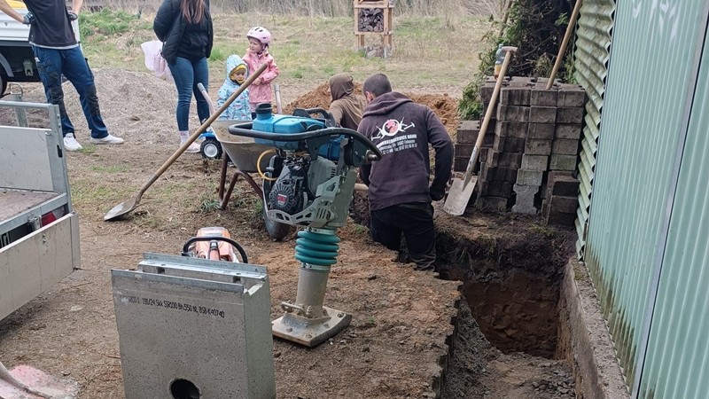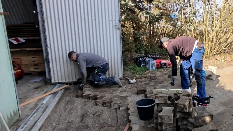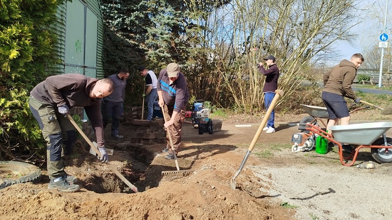 Dazu sind einige Schritte zu tun. Als Lars Markert hörte und sah, dass es ein Entwässerungsproblem vor dem Hallentor gab, aktivierte er seine Freunde und nahm sich dem an. Am 22. März war es soweit und sie schritten zur Tat. Ausbau des alten Pflasters auf einem breiten Streifen vor dem Hallentor, Ausbau alten Unterbaus, Einbau einer Entwässerungsrinne mit Unterbau aus Beton, und Herstellen eines Ableiterohres mit Versickerungspunkt mit schneckenförmig ausgelegtem Rohr standen auf dem Programm. Alles war gut durchorganisiert und die vier Aktiven Lars Markert, Nicolai Hahn, Marco Rippert und Lennard Hoecker vollbrachten das Werk.