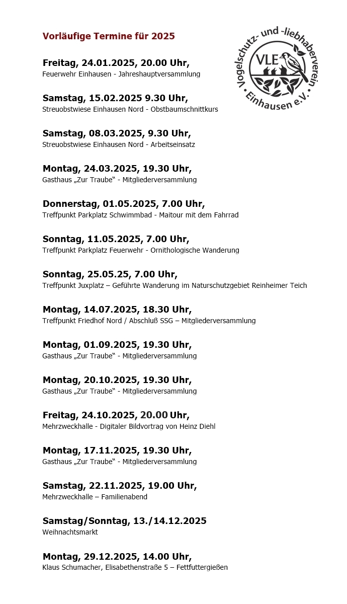 Unser nächster Arbeitseinsatz findet am Montag 29. Dezember 2025 statt. Zum Winterfettfuttergießen treffen wir uns in der Elisabethenstr 5, bei Klaus Schumacher der Arbeitseinsatz beginnt um 14.00 Uhr, zu dieser Veranstaltung sind alle Mitglieder herzlich Eingeladen.
