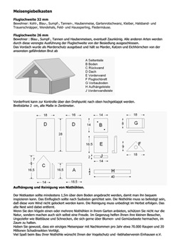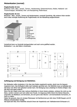 Nisthilfen Bauanleitungen.Der Nistkasten sollte mindestens 1,5m über dem Boden angebracht werden, damit man ihn bequem inspizieren kann. Das Einflugloch sollte nach Sudosten gerichtet sein. Die Nisthöhle muss so befestigt sein, daß diese vom Wind nicht gelockert werden kann. Die Reinigung muss unbedingt im Herbst erfolgen. Das alte Nest wird dabei entfernt. Wenn Sie den Vögeln einen oder mehrere Nisthöhlen in ihrem Garten anbieten, schützen Sie nicht nur die Natur, sondern machen auch sich selbst eine Freude. Im Gegenzug helfen Ihnen ihre kleinen Besucher, Ungeziefer wie Blattläuse und Schnecken, die sich gerne über Blumen- und Gemüsebeete hermachen, im Zaum zu halten. Haben Sie gewusst, dass ein einziges Meisenpaar mit Nachkommen pro Jahr etwa 70.000 Raupen und 20 Millionen Schadinsekten Vertilgt. Viel Spaß beim Bau Ihrer Nisthöhle wünscht Ihnen der Vogelschutz und -liebhaberverein Einhausen e.V.